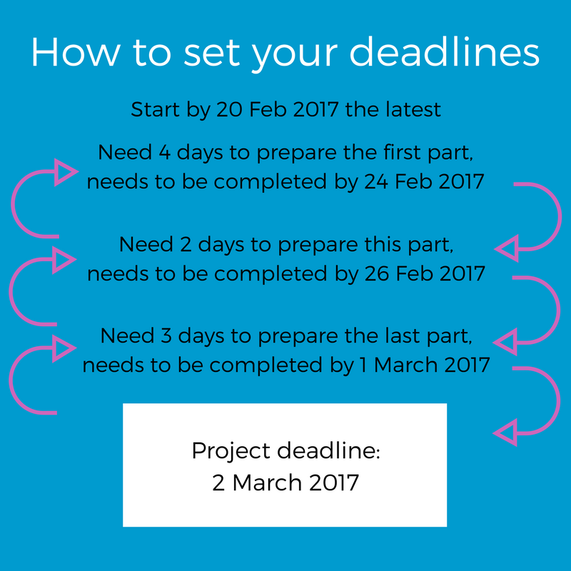 With your project defined, set yourself deadlines. If you’ve broken down your project, look at the day it needs to be completed. You then work backwards. How long will it take me to complete the last task? Let’s say 3 days. You deduct 3 days from your deadline and would have to start by then. If you have multiple mini projects, you can follow this backtracking method for each activity to determine your start date.